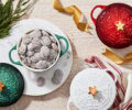 The Noël Collection features some of our best-selling cookware and kitchen accessories, but with festive features that embrace the delight of the holiday season. The beloved holiday carol is the inspiration for the 12 Days of Christmas Round Dutch Oven and Partridge in a Pear Tree Platter. The delicate gold scrollwork is the perfect backdrop for oven to table bubbling casseroles, cookies for Santa and more. Bake and serve holiday appetizers, desserts and gifts from the kitchen in the Noël Mini Cocotte with Star Knob, while the cook in your life will appreciate the Noël Holiday Tree Spoon Rest to keep counters clean in festive style.